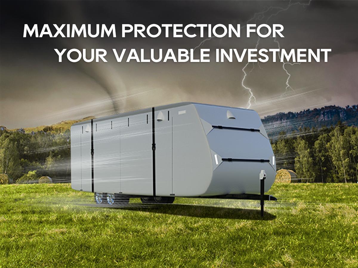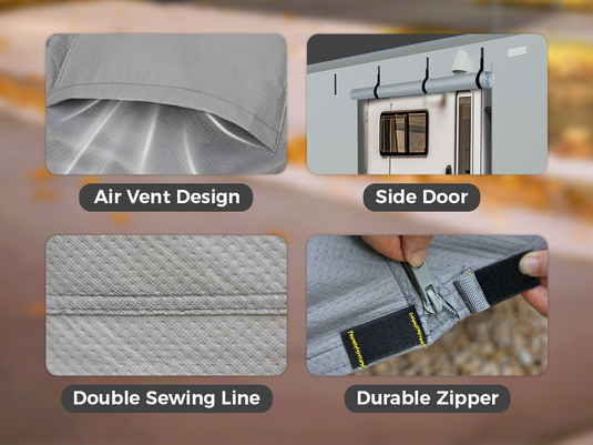 This rugged trailer cover is built with strategic air vents and a reinforced double sewing line for enhanced durability. The side-access zipper offers convenience, making it an essential camper trailer cover for protecting your investment from sun, rain, and debris. Tough, practical, and secure!